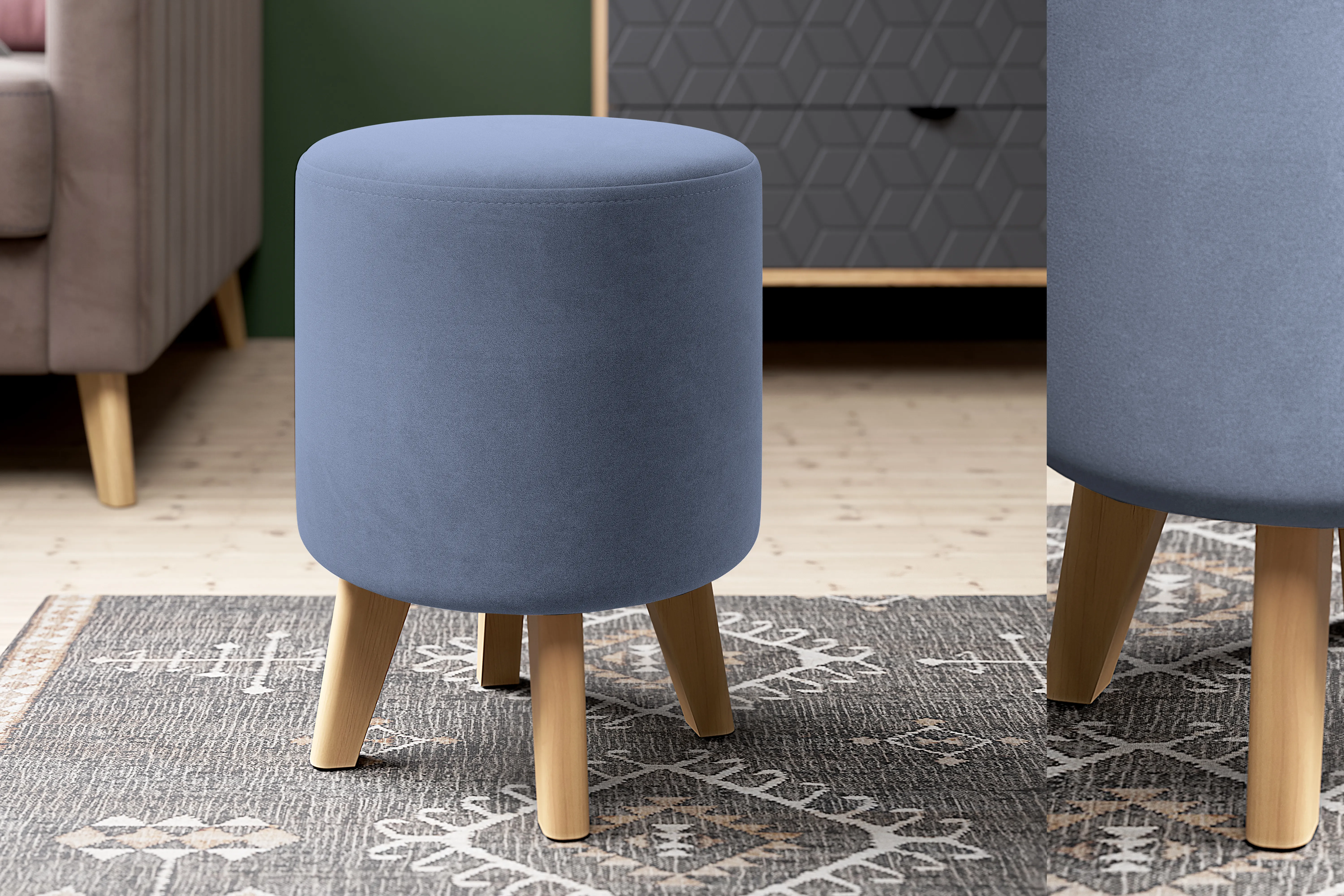 Круглая банкетка на ножках - это удобный и стильный предмет мебели, который может быть использован как место для сидения или как прикроватный пуфик. Она выполнена из ткани, что позволяет ей быть мягкой и удобной для сидения.