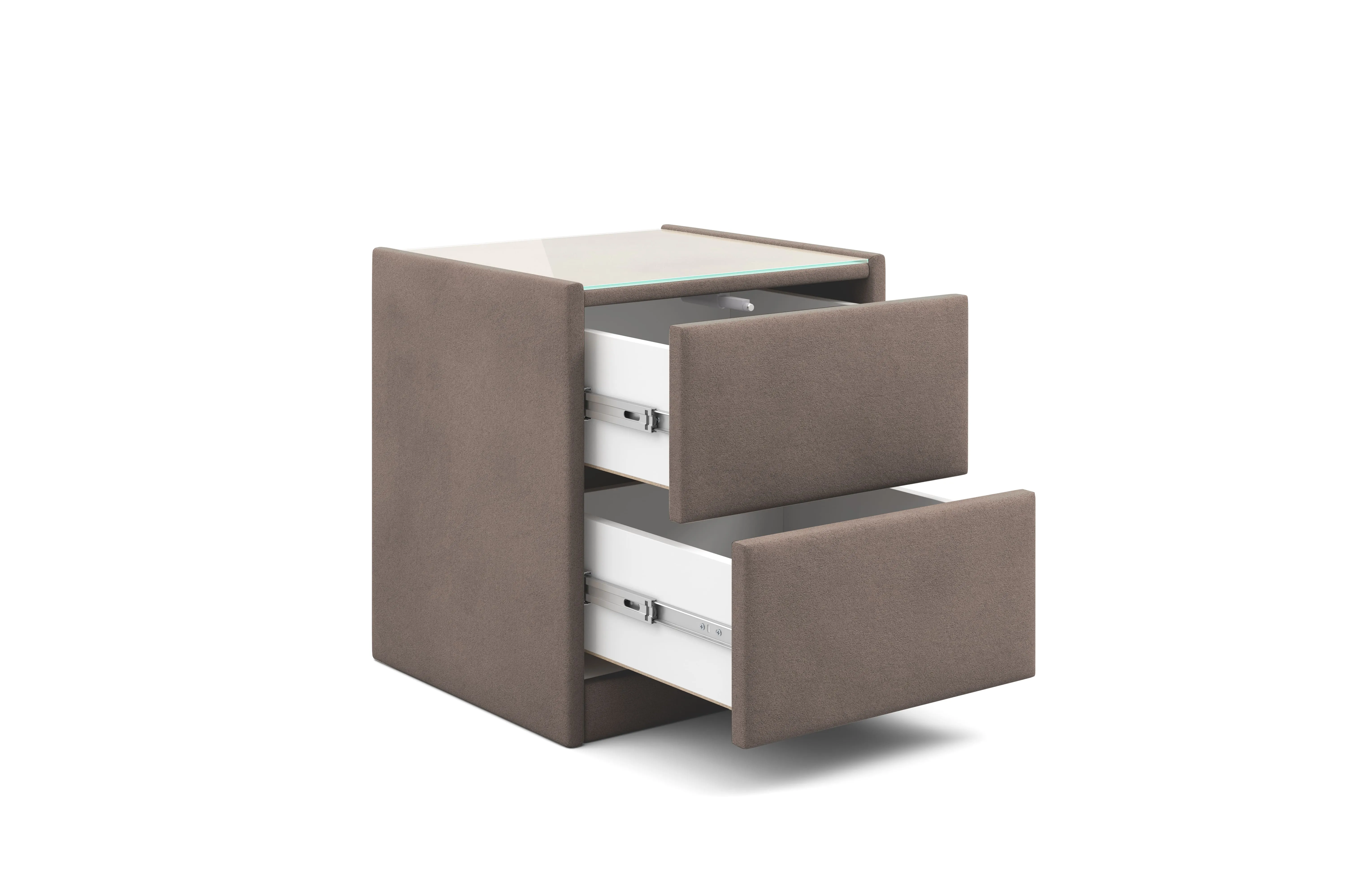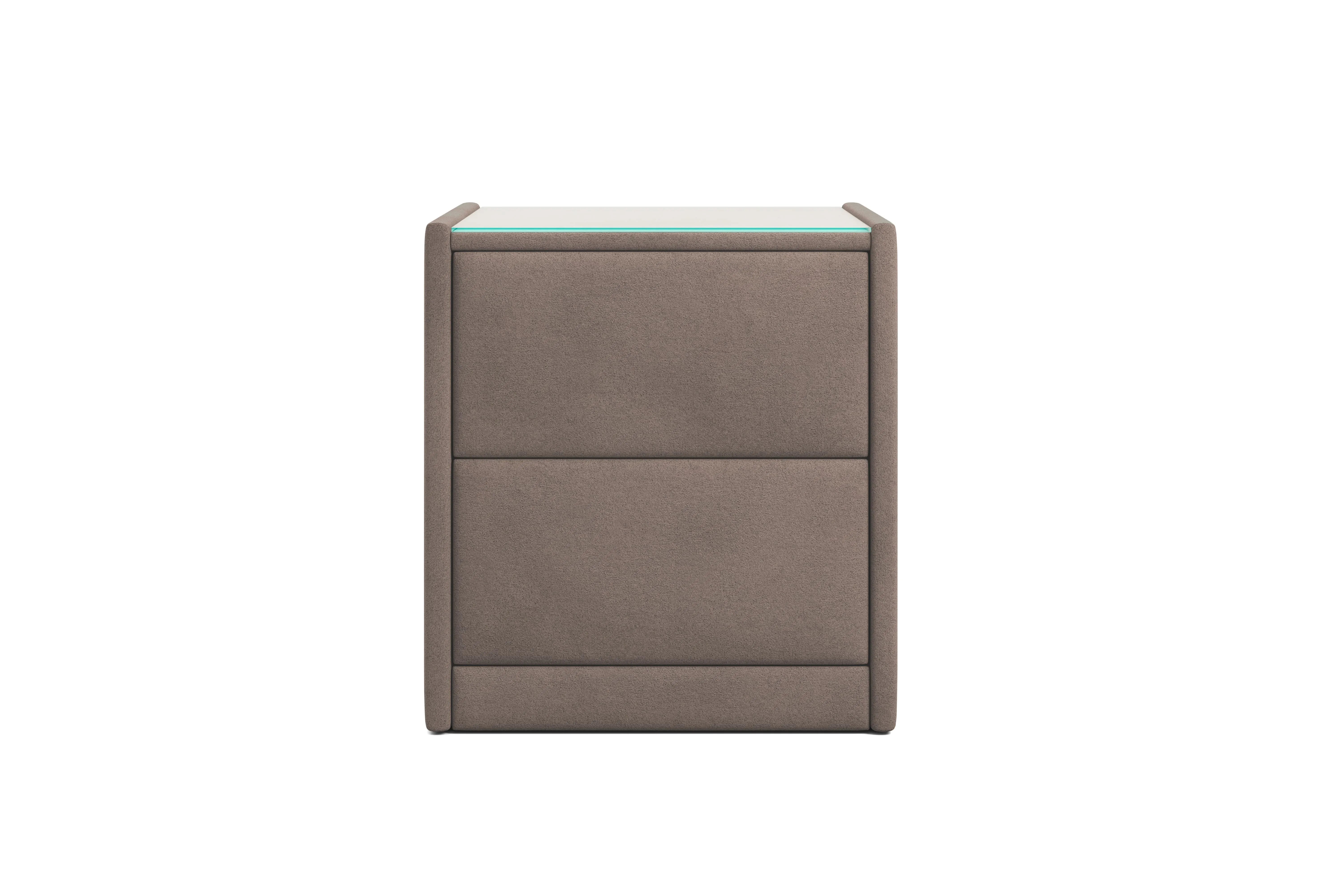 Тумба обтянута высококачественным велюром, что придает ей особый уют и комфорт. Имеет стеклянную столешницу и два вместительных выдвижных ящика с механизмом Push to open. Скругленные торцы модели, минимизируют риск удариться в темноте.