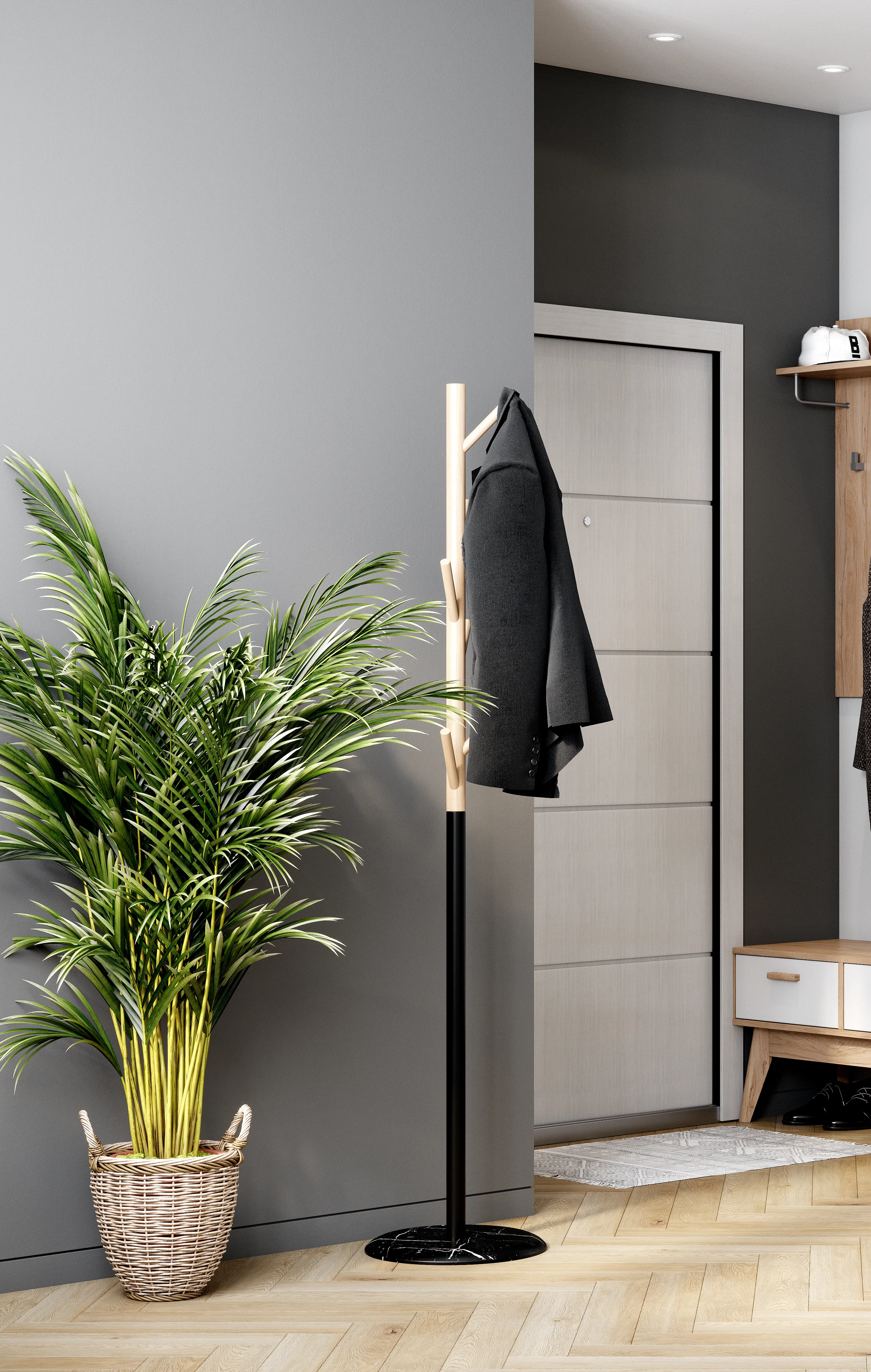 Вешалка представляет собой разборную конструкцию, которая состоит из основания МДФ 25 мм, в которое вставляется утяжелитель и с помощью шпильки М8 через металлическую трубу фиксируется деревянная опора с крючками, выполненная из массива березы. Масса утяжелителя 4 кг.