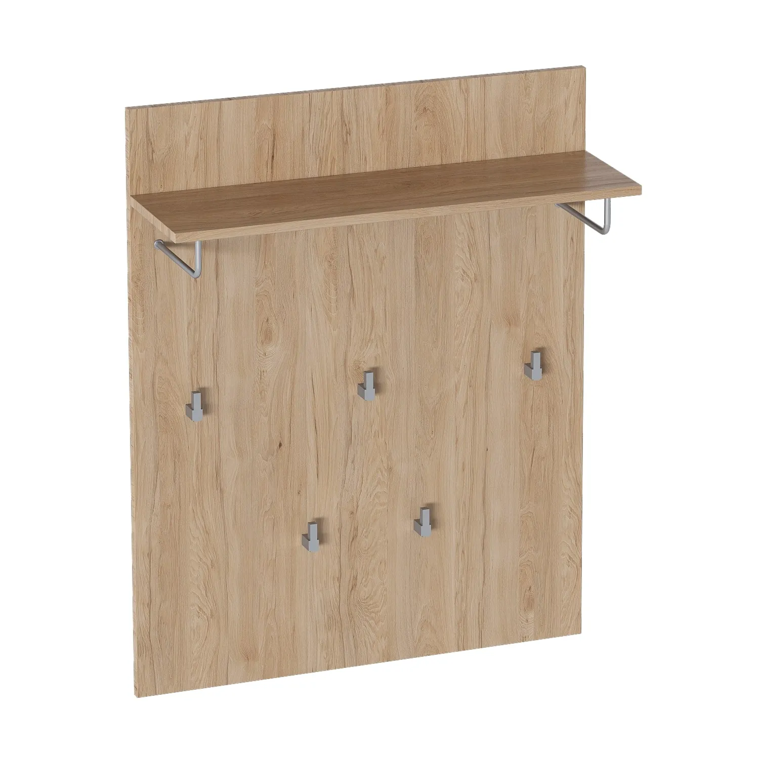 Панель вешалки выполнена из ЛДСП цвета натурального дуба, оснащена крючками для верхней одежды и полкой, на которой можно удобно разместить сумки, зонты, головные уборы. Пластиковые серые крючки расположены так, чтобы можно было равномерно распределить нагрузку по вешалке, а висящие пальто и плащи не мешали друг другу. Полка и каждый из крючков рассчитаны на вес до 4 кг.